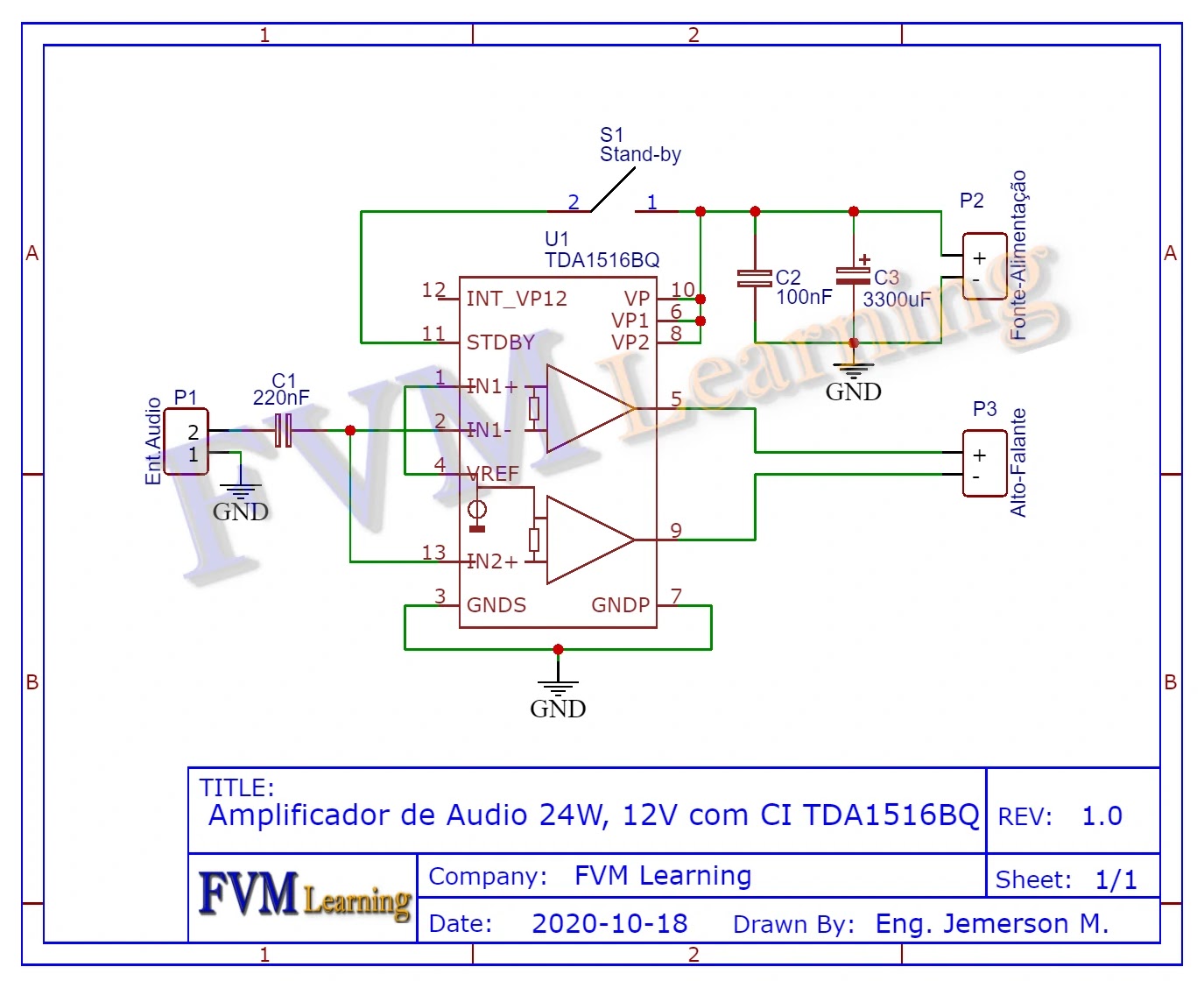 Na Figura 2 temos o diagrama esquemático do circuito Amplificador de Audio 24W, 12V com CI TDA1516BQ, como podemos visualizar, são poucos os componentes externos, ele é de fácil montagem, e tem alta qualidade sonora, tornando um excelente amplificador para se montar, com baixo custo e alta performance.