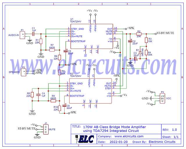 | Bridge (2x TDA7294) | 16Ω | ±35V | 170W |
