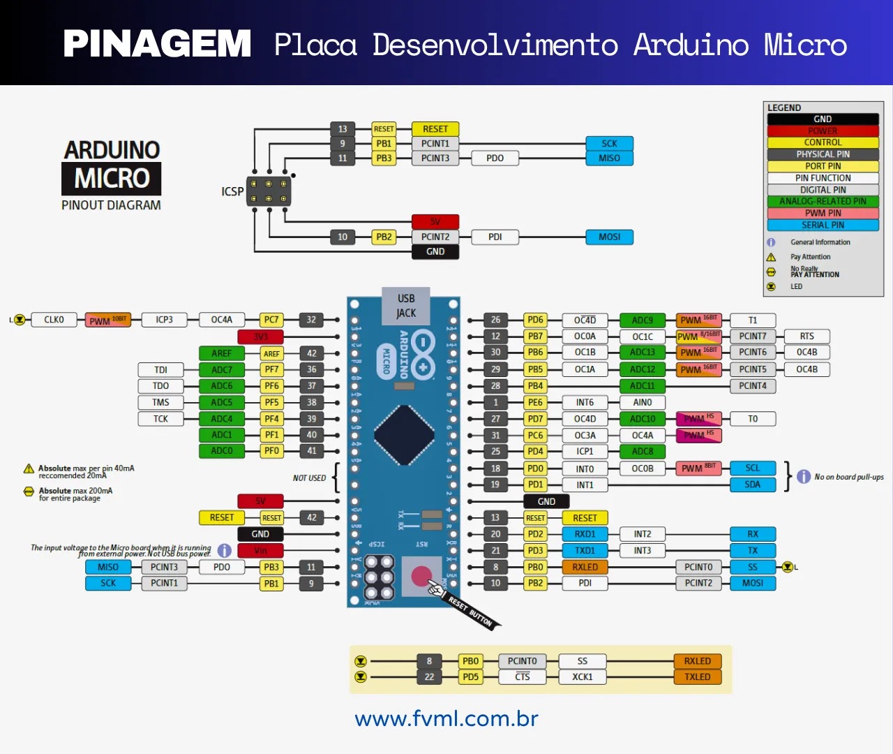 Este guia de pinagem do Arduino Micro foi desenvolvido para fornecer uma