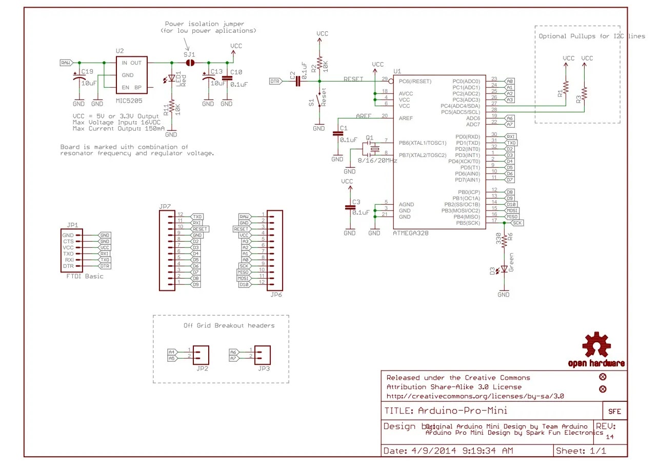 O diagrama esquemático do Arduíno Pro Mini mostra como os componentes estão