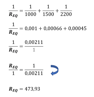 Como em nosso exemplo utilizamos três resistores diferentes, podemos utilizar a soma algébrica apresentada na fórmula matemática abaixo, para realizarmos o somatório e chegarmos ao Resistor Equivalente “REQ”, como ilustrado na Fórmula abaixo.