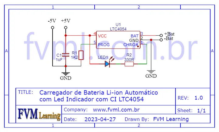 | Carregador de Bateria Li-ion Automático com Led Indicador com CI LTC4054 |