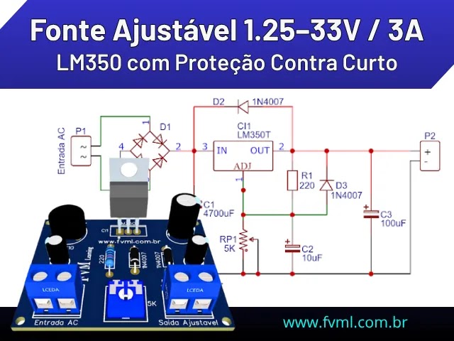 Fonte Ajustável 1.25V a 33V – 3A com Proteção Contra Curto-Circuito: LM350 + PCI