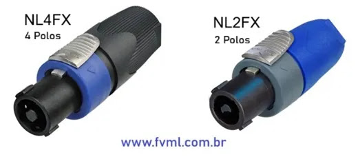 “text”: “O NL2 (ou NL2FXX) possui apenas 2 contatos (+1, -1) e é usado para ligações simples (um canal). O NL4 (ou NL4FXX) possui 4 contatos (+1, -1, +2, -2) e é mais versátil, podendo ser usado tanto para ligações simples (usando apenas os pinos 1) quanto para bi-amplificação (usando os 4 pinos para enviar dois sinais diferentes pelo mesmo cabo).”