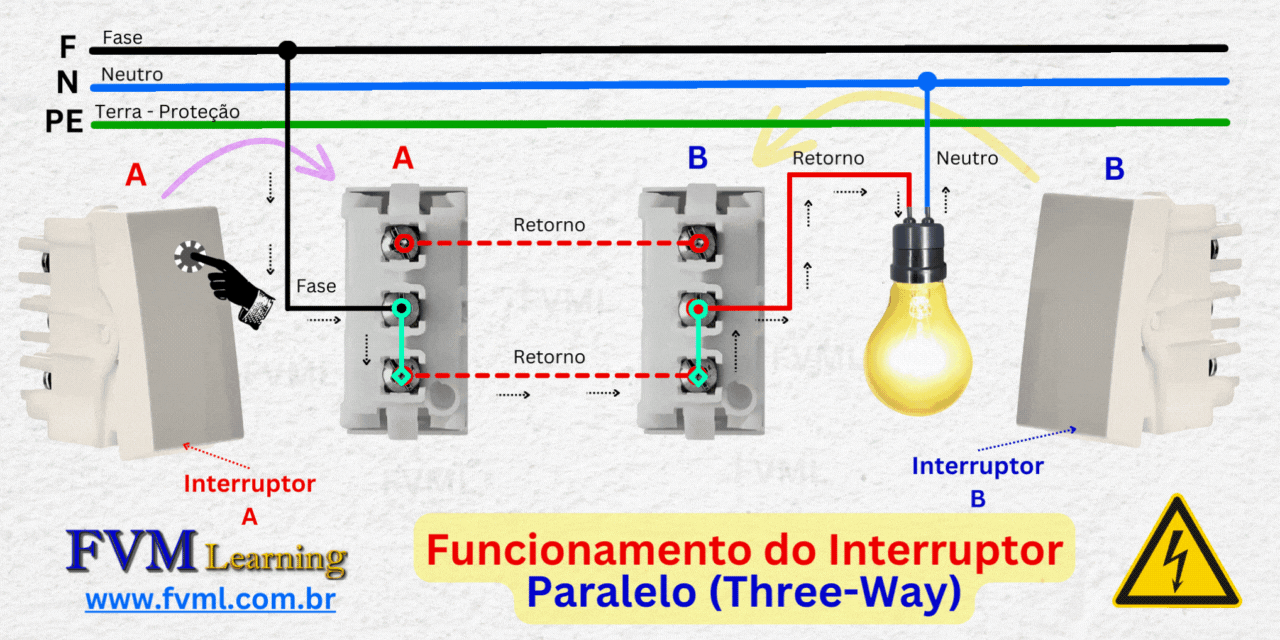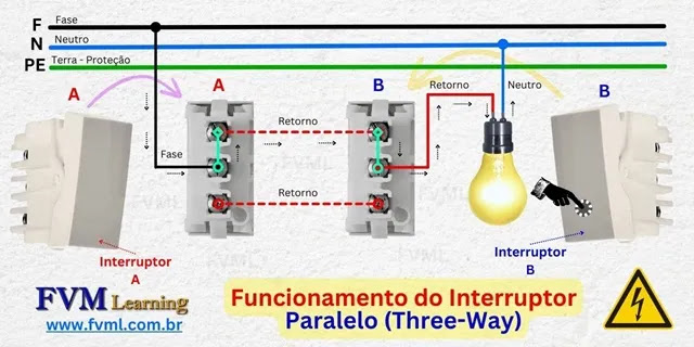 Dessa forma, quando o interruptor A é ligado, o interruptor B tem a possibilidade de acionar ou desligar o dispositivo de iluminação, e vice-versa.