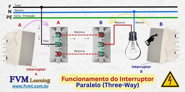 Descubra como funciona o interruptor paralelo (three-way) e aprenda a instalá-lo com este guia passo a passo com diagrama de conexões. Iluminação controlada em múltiplos pontos!