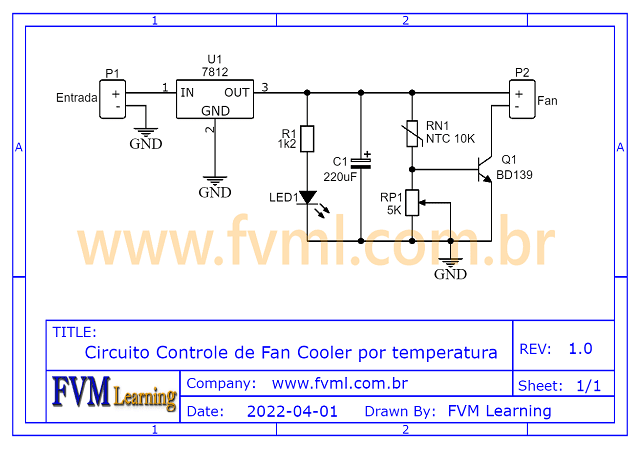 O Circuito Controle de Fan Cooler por temperatura utiliza Thermistor (NTC) que é um sensor de temperatura, que em conjunto com o trimpot RP1 formam um divisor de tensão, quando a temperatura é elevada.