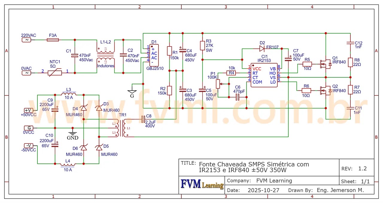 Fonte Chaveada SMPS 2×50V 350W com IR2153 e IRF840 – Guia Completo + PCB