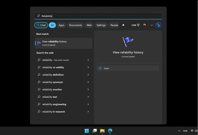 • Clique no “Monitor de Confiabilidade” ou “View Reliability History” na lista de resultados para abrir, como ilustrado na