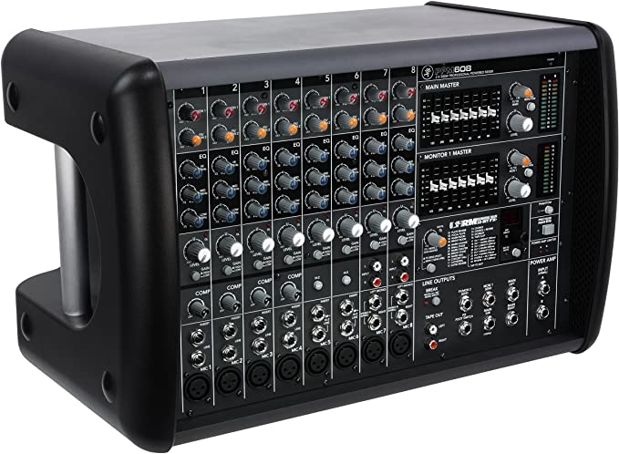 As mesas de som do tipo amplificadas, como a mesa de exemplo mostrado na Figura 4 abaixo, são mesas de som que contém integrada em seu corpo, um amplificador de potência.