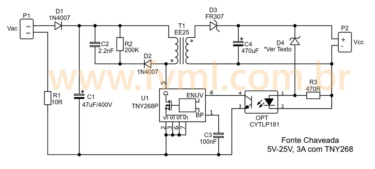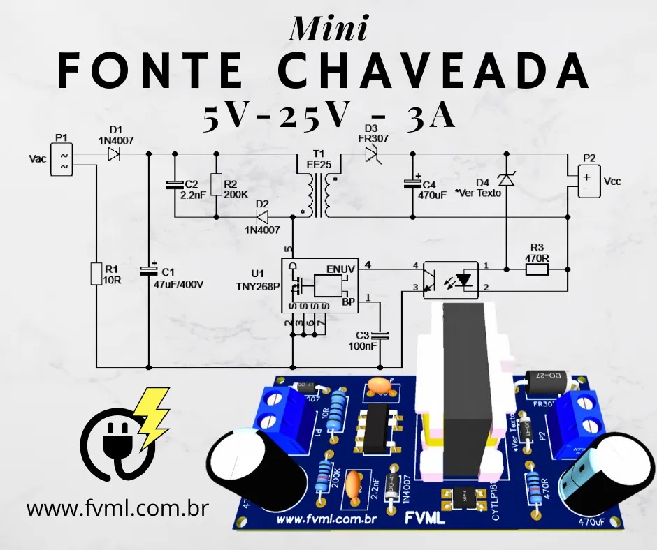 Mini Fonte de Alimentação Chaveada 5V – 25V, 3A com TNY268 com PCI