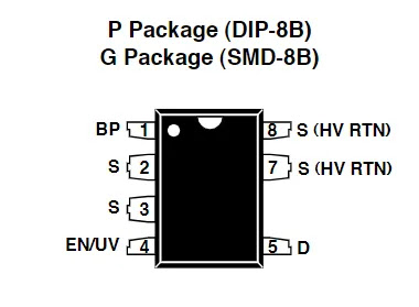 O TNY268 vem encapsulado em estrutura DIP-8B para pinagem