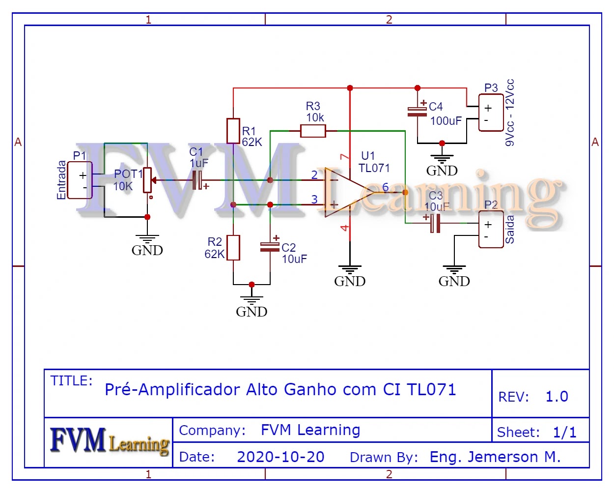 No post de hoje, iremos apresentar um Pré-Amplificador com ótima qualidade sonora, com baixo ruído e baixa distorção harmônica (THD), o consumo é bastante baixo 1.4mA podendo ser alimentado também por uma bateria de 9V. O circuito pré-amplificador é baseado no Circuito Integrado TL071.