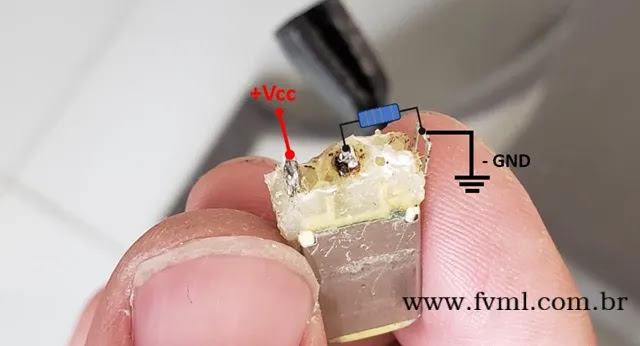 Como podemos notar, ele vem com um resistor conectado entre o pino central e o