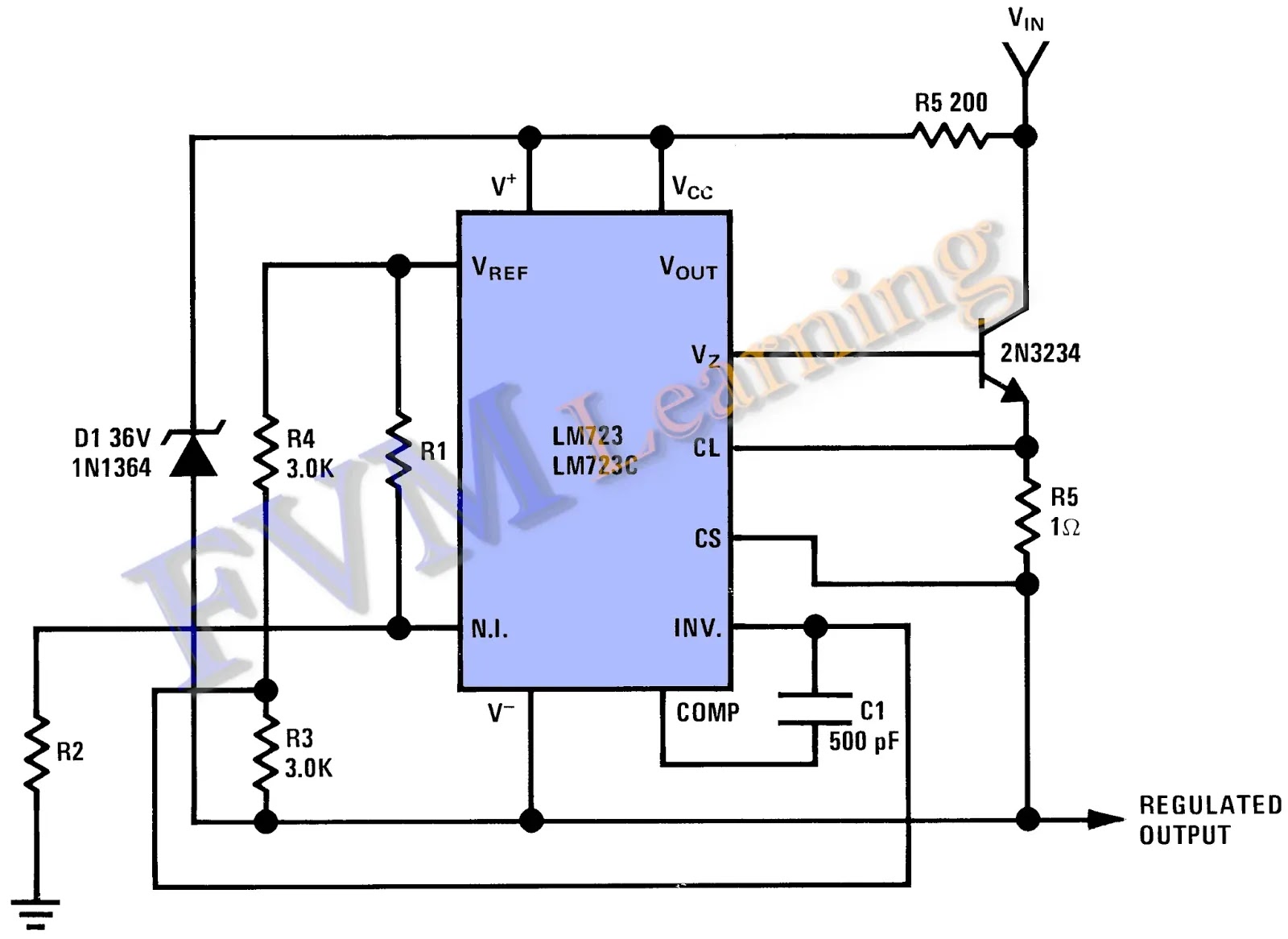 O LM723 é um regulador de tensão de alta precisão programável, montado em encapsulamento plástica dupla em linha de 14 derivações. O circuito fornece limitação de corrente interna. Quando a corrente de saída exceder 150 mA, um elemento externo NPN ou PNP pode ser usado. São feitas provisões para limitação de corrente ajustável e desligamento remoto. O diagrama de bloco esquemático do Circuito Integrado está descrito na figura 2 abaixo.