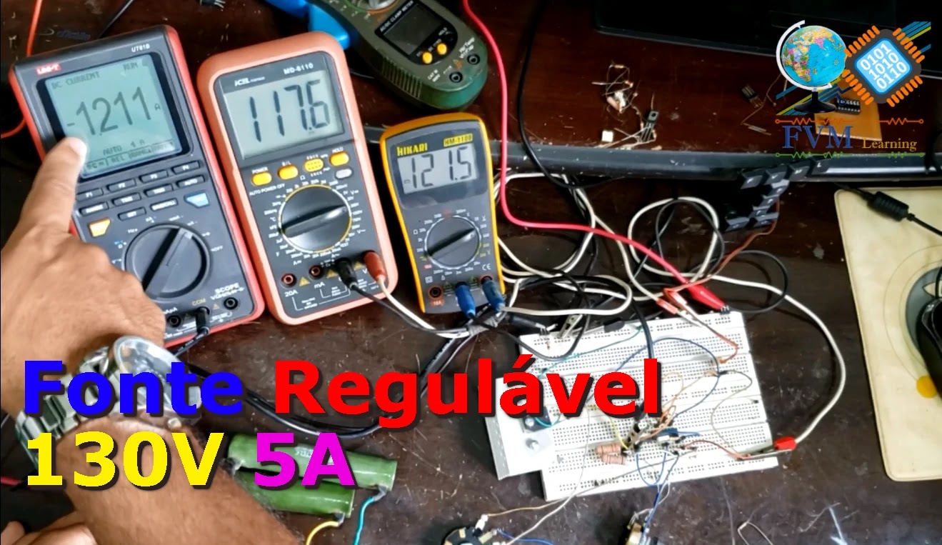 Baseado nos testes que fizemos, com o resistor sugerido pelo fabricante não alcançamos os 130V desejado, e a tensão mínima na saída dem 27V, será necessário recalcular esses resistores, com a carga conectada, alcançamos uma corrente de 1.208A, e a tensão máxima foi de 117.6V. A carga esquentou bastante, e o transistor ficou muito quente, não suportaria ficar com essa carga por longo tempo.