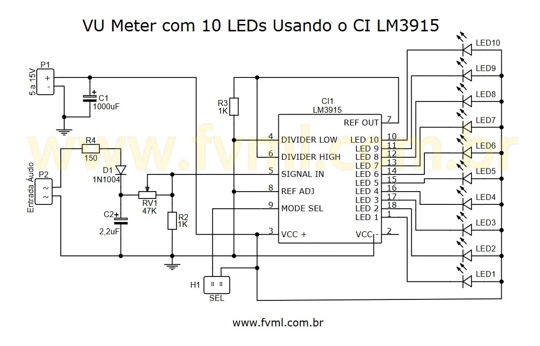 Montar um VU Meter com 10 LEDs utilizando o circuito integrado LM3915 é